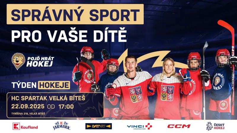 Přijďte v pondělí 22. září od 17 hodin s dětmi na nábor a užijte si spoustu hokejové zábavy!V pondělí 22. září 2025 od 17:00 budou mít všechny děti od 4 do 8 let bez rozdílu dovednosti bruslení jedinečnou možnost vyzkoušet si zdarma, jaké to je být hokejistou nebo hokejistkou. HC Spartak Velká Bíteš pořádá ve spolupráci s Českým hokejem na bítešském stadionu v rámci Týdne hokeje náborovou akci. Kromě zážitku v podobě prvních krůčků na ledě si každé dítě navíc s sebou domů odnese zajímavý hokejový dárek. Přijďte si vyzkoušet lední hokej a zažijte spoustu zábavy!Co všechno je potřeba si na akci přinést? Stačí jen brusle, helma a rukavice (postačí i lyžařská helma a rukavice). V případě, že máte doma chrániče loktů a kolen pro in-line bruslení, vezměte je rovněž s sebou. Pokud nedisponujete bruslemi a helmou, můžete se obrátit na trenéra Otu Budína (tel. 731 935 651) s dotazem na možnost zapůjčení vybavení přímo na místě.Týden hokeje je série sportovních akcí pro děti ve věku 4 – 8 let a jejich rodiče, kterým se naskytne unikátní příležitost seznámit se s hokejovým prostředím. Pro děti je připraven zábavný program na ledě i mimo něj, rodiče zde získají podrobné informace o tom, co obnáší mít doma malého hokejistu a jaký je přínos ledního hokeje pro fyzický a osobnostní rozvoj dětí.Akce Týden hokeje se v rámci projektu Pojď hrát hokej po celé České republice koná již více než deset let. Díky dosavadním ročníkům získalo první zkušenost s ledním hokejem více než 40 000 dětí. Více informací najdete na www.tydenhokeje.cz a www.pojdhrathokej.cz.Těšíme se na vás!